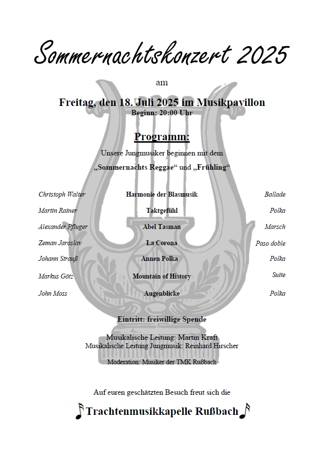 Wir laden euch ganz herzlich zu unserem Sommernachtskonzert am 18.07.2025 beim Musikpavillon in Rußbach ein! Anschließend findet am Sonntag unser traditioneller Tag der Blasmusik statt. Wir freuen uns auf viele Besucher!